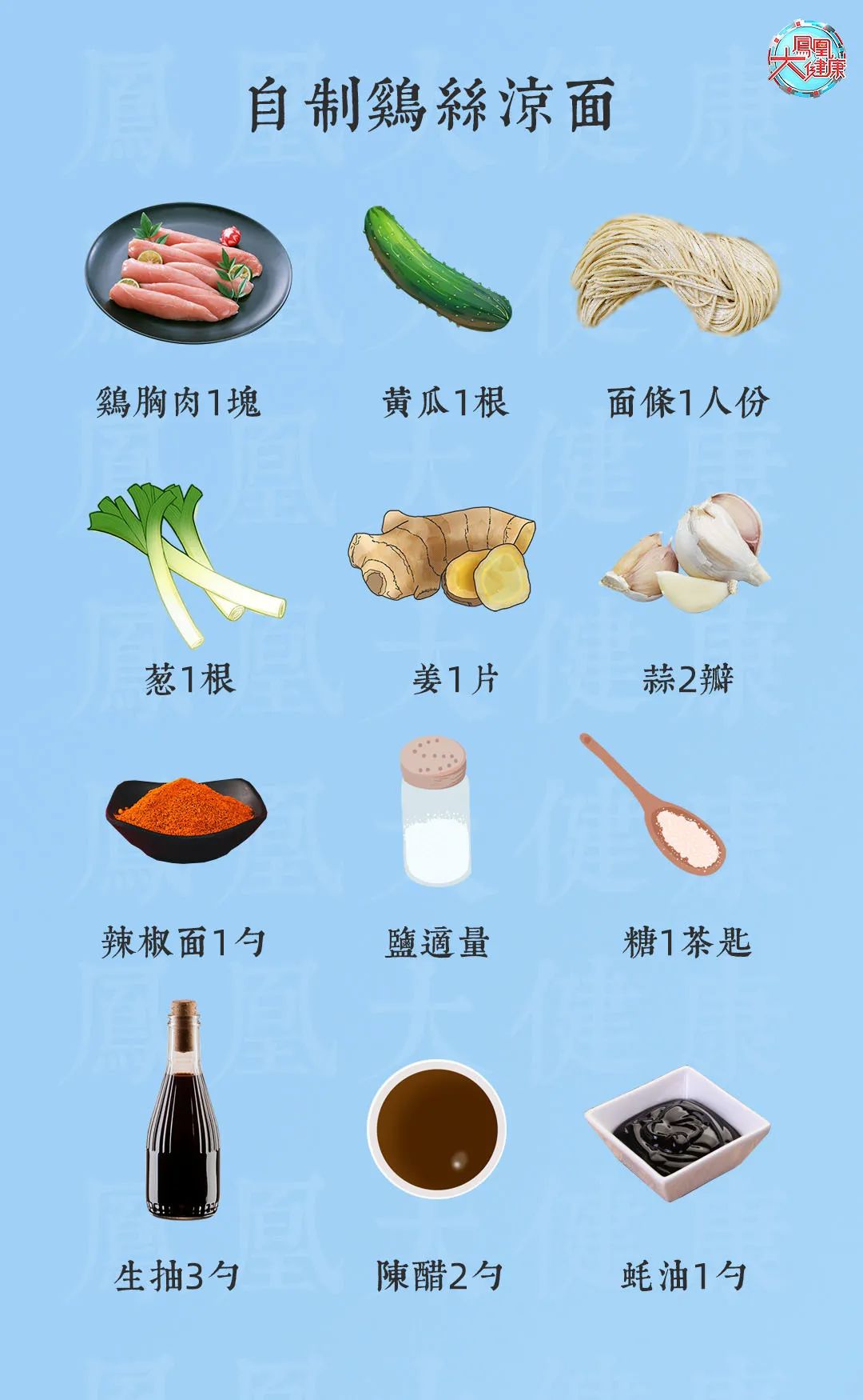 【用料】鸡胸肉1块,黄瓜1根,面条1东谈主份,葱1根,姜1片,蒜2瓣,辣椒面1勺,盐适量,糖1茶匙,生抽3勺,陈醋2勺,白砂糖适量,蚝油1勺,料酒1勺,白芝麻适量