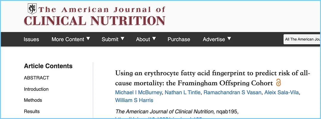 1、Michael I McBurney, Nathan L Tintle, Ramachandran S Vasan, Aleix Sala-Vila, William S Harris. Using an erythrocyte fatty acid fingerprint to predict risk of all-cause mortality: the Framingham Offspring Cohort. The American Journal of Clinical Nutrition, 2021; DOI: 10.1093/ajcn/nqab195